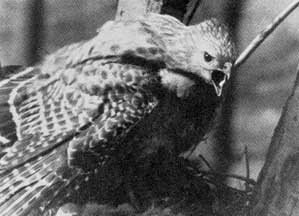 On the second week in April we again visited our hawk. The brooding bird was at home, but she flushed before we were within a hundred yards. We completed the blind and made motion films showing the barren woods of early April, and from the nesting tree I made studies of four beautifully marked, brown-splotched eggs.