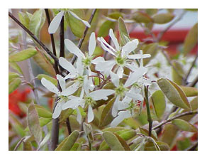 The flowers of the serviceberry are typically white, although at times they can be pink, yellow or streaked with red. The fruit is excellent to eat raw, tasting somewhat like a blueberry, strongly accented by the almond-like flavor of the seeds. The wood is brown, hard, close-grained, and heavy. The heartwood is reddish-brown, and the sapwood is lighter in color.